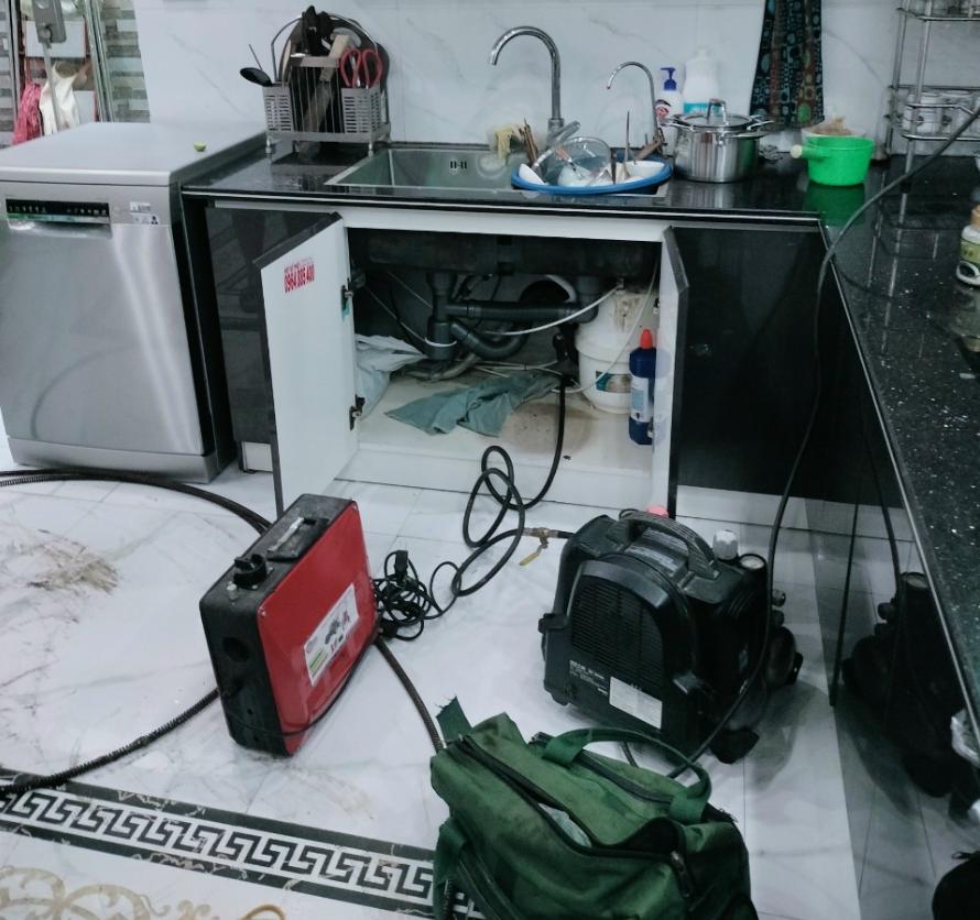 Chậu rửa bát dễ bị tắc bởi dầu mỡ, thức ăn thừa. Công ty áp dụng máy thông áp lực cao để làm sạch nhanh chóng, giúp chậu rửa luôn thông thoáng, không còn mùi hôi.